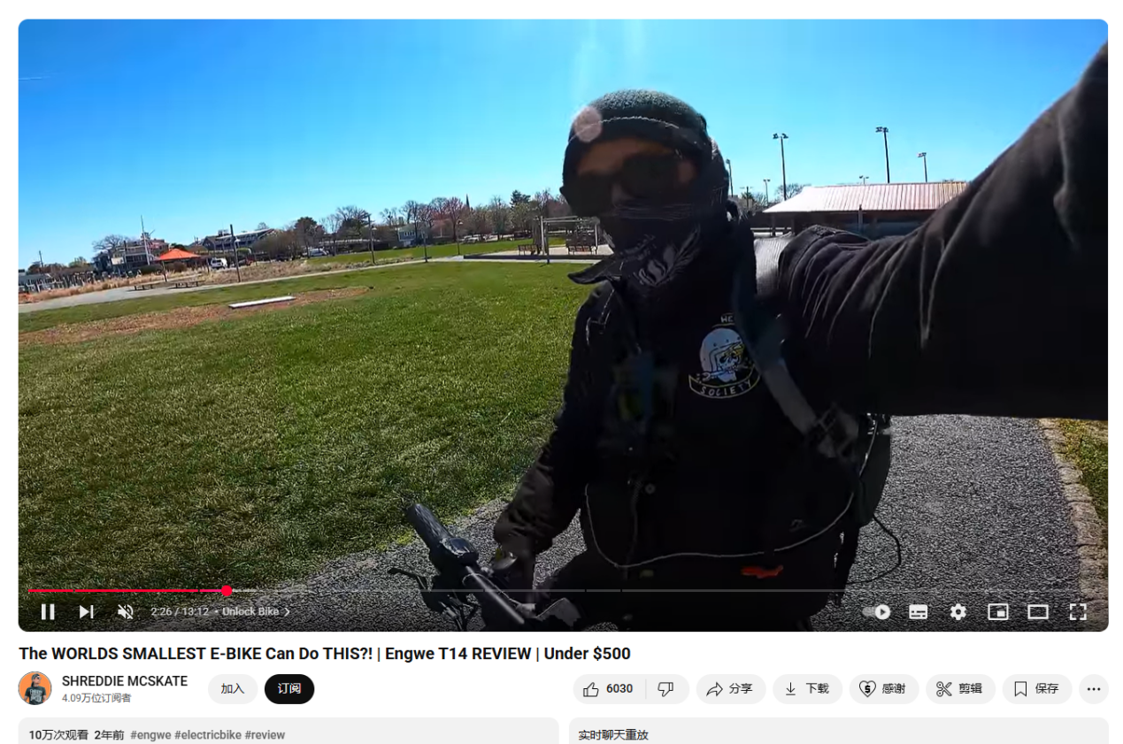 拥有4.09万订阅者的科技博主SHREDDIE MCSKATE就是品牌的合作博主之一,其为Engwe T14这款小型轻量的电动自行车拍摄了一条户外骑行实测视频,截至目前,观看量已达到10万次。