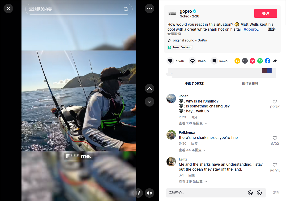 例如其在2025年2月发布的一条用户在海上遇见大白鲨的视频,视频内划艇上的用户被白鲨包围,不断宣扬着紧张的氛围,而gopro相机完美的将这一幕记录了下来,最终该视频获得了1950万播放量,为品牌带来了不小的声量。