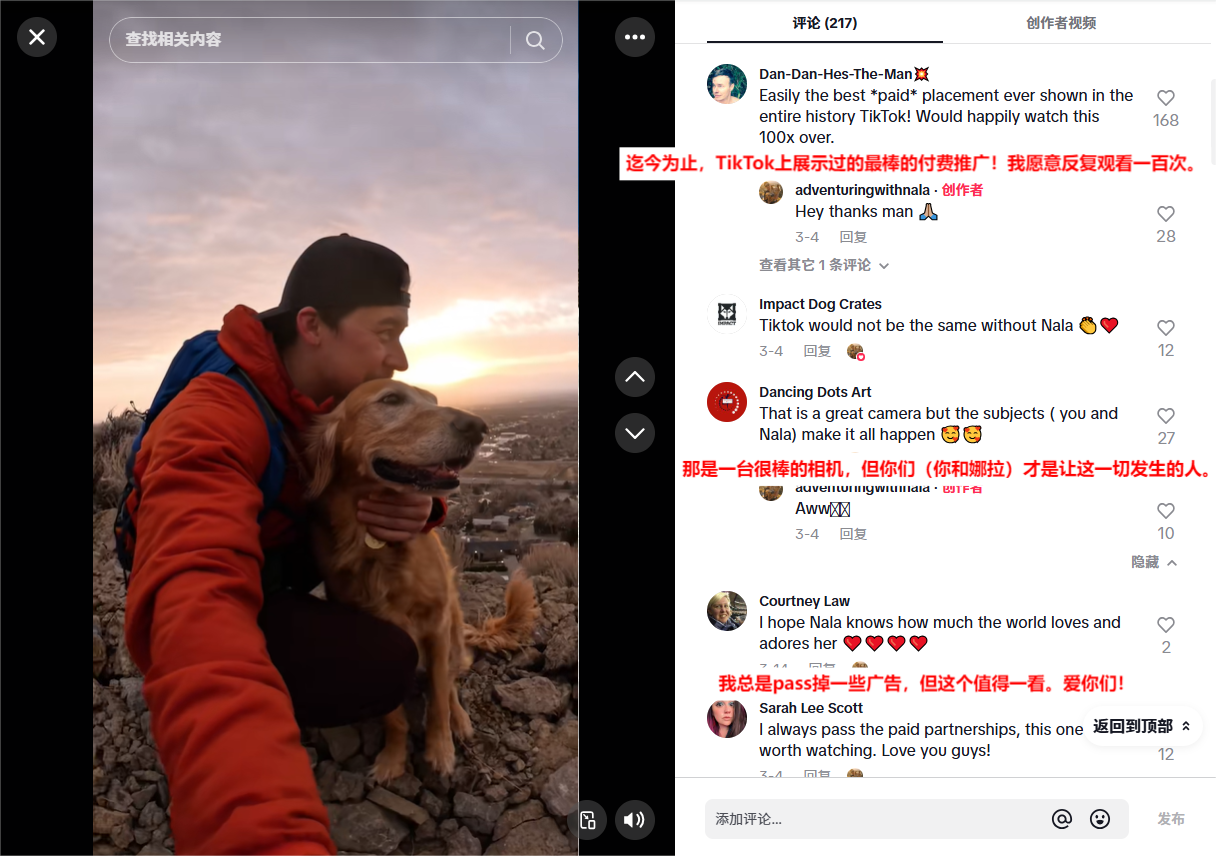 最终,该视频单条播放量突破百万,评论区涌现大量“最棒的商业广告”、“相机很棒狗狗也很棒”等正向反馈,实现了软种草与情绪共鸣的双赢。