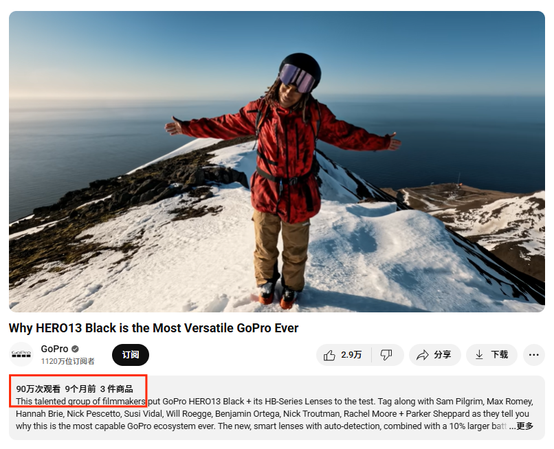 例如,其发布在置顶的产品测评视频“Why HERO13 Black is the Most Versatile GoPro Ever”,通过多位电影制作人对HERO13 Black及配套镜头的实际测试,全方位展示了其多功能性。