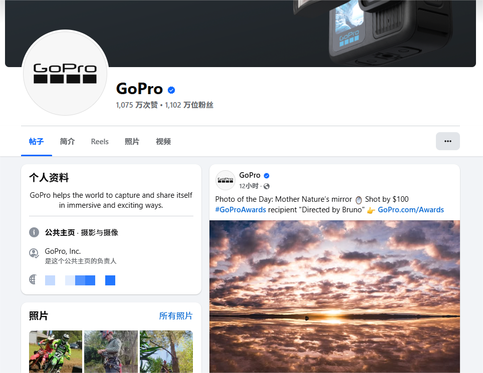 同时,GoPro品牌也灵活运用Facebook的多种内容格式(帖子、Reels短视频、照片、长视频)来呈现用户作品、讲述品牌故事、发布活动信息,保持主页的活力和吸引力。