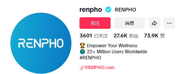 Renpho品牌在TikTok上的官方账号@renpho目前拥有2.76万粉丝,获赞量为7.39万。