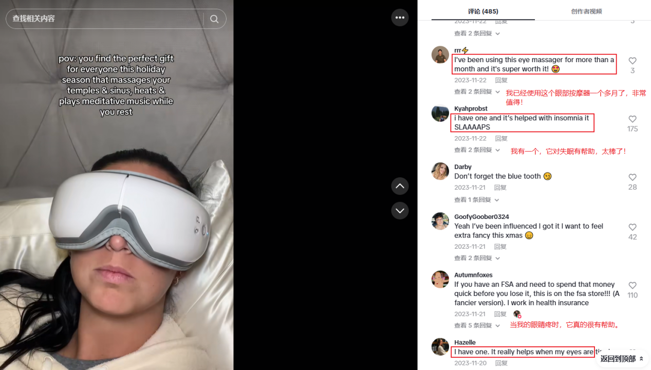 拥有2.69万粉丝的TikTok达人@caro_manning,便为Renpho品牌的眼部按摩仪拍摄了体验视频。
