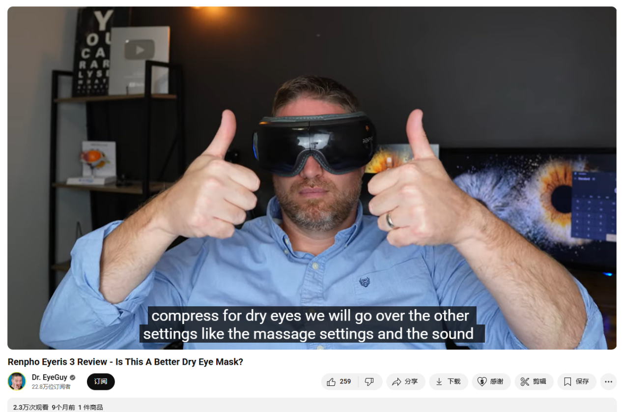 拥有22.8万订阅者的科技博主Dr. EyeGuy就是Renpho品牌的合作者之一,其为Renpho Eyeris 3 这款全新款的眼部按摩仪拍摄了一条详细的测评视频,截至目前,观看量已达到2.3万次。