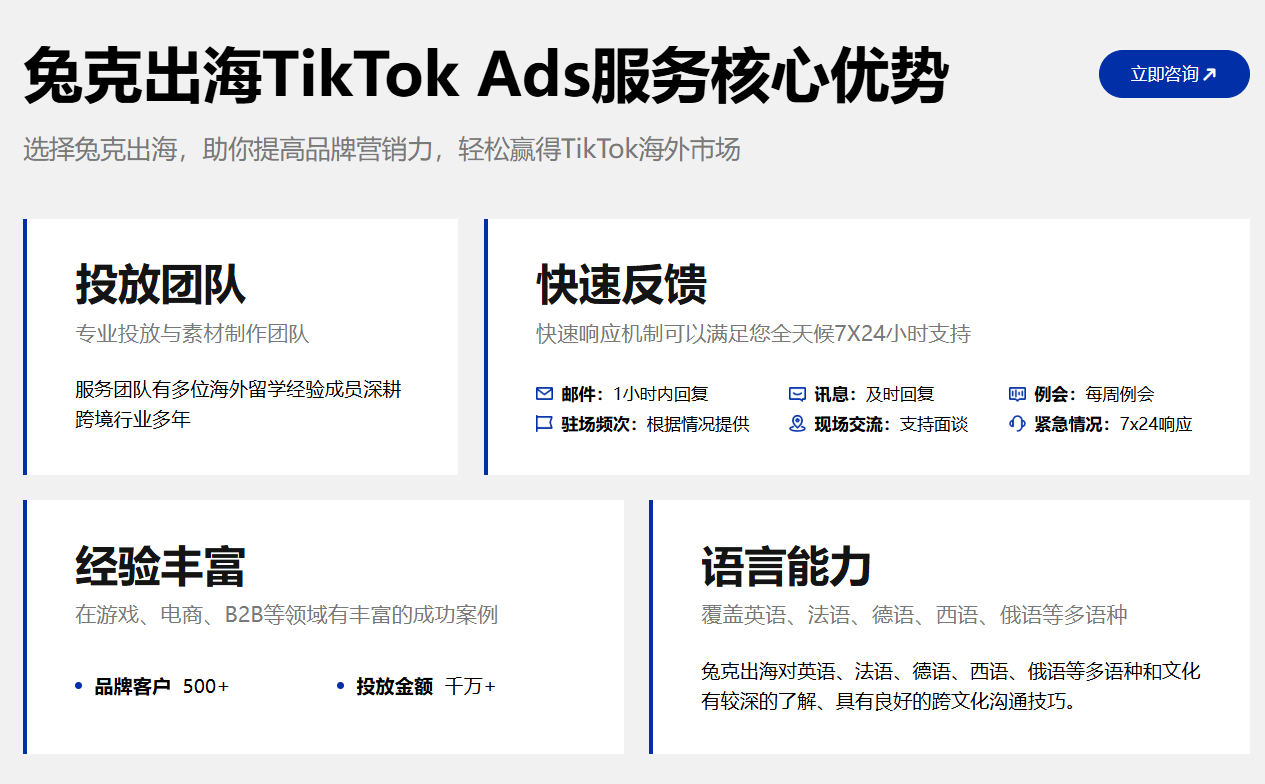 比如兔克出海,就是目前不少跨境卖家会选择的合作方,是专业的TikTok出海营销综合服务商,致力于助力中国出海企业生意增长,他们不仅能协助完成TikTok广告开户流程,还能在后续的投放策略、广告素材制作、平台对接等方面提供全方位支持。