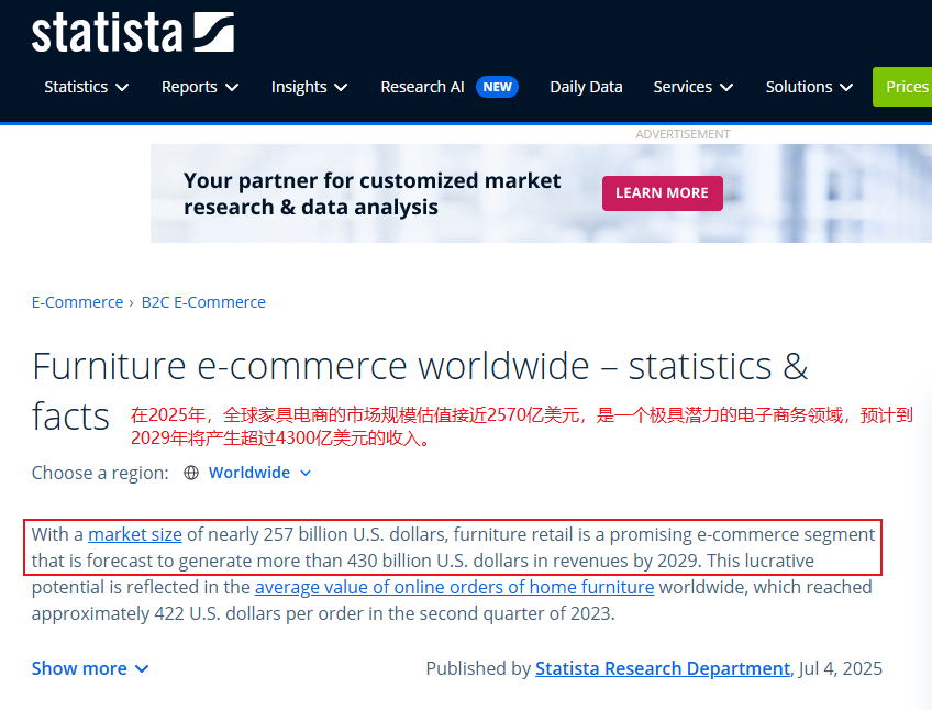 据statista数据显示,2025年全球家具电商市场规模估值接近2570亿美元,预计到2029年将突破4300亿美元。