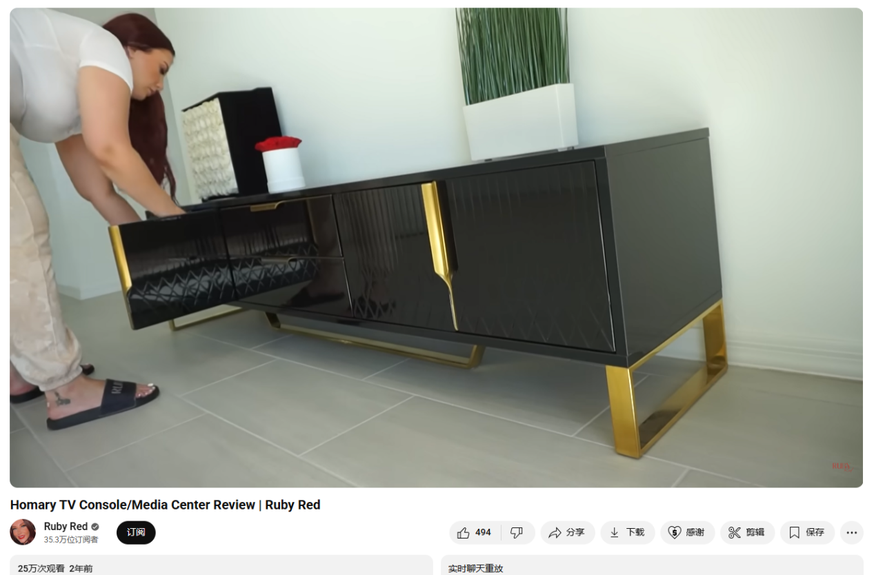 拥有35.3万订阅者的家居博主Ruby Red就是品牌合作的测评者之一,其为Homary的电视柜拍摄了一条详细的使用测评视频。