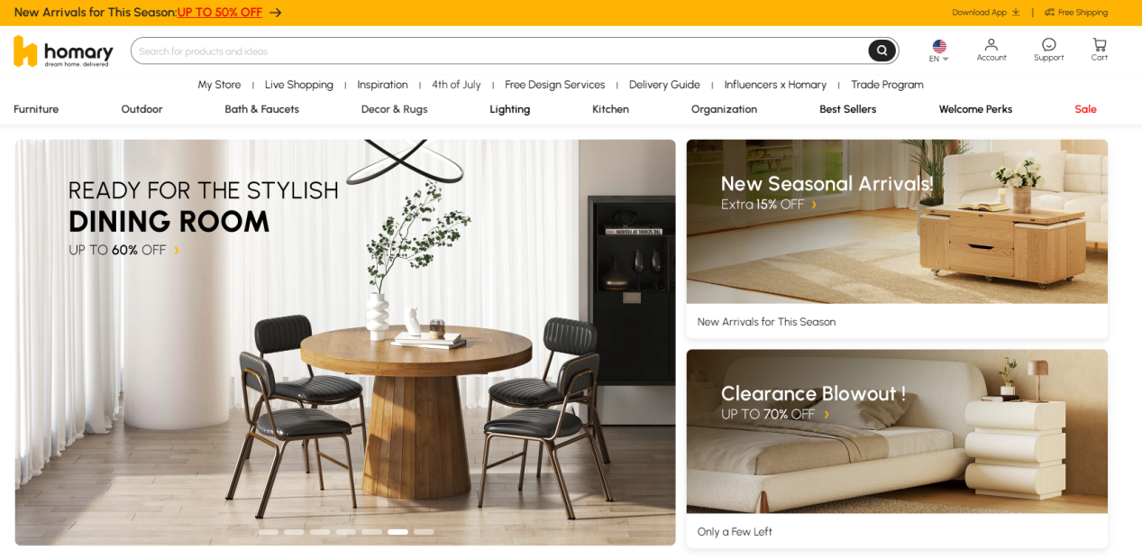 首先是运营自主性,品牌可以完全掌控页面设计、促销节奏和用户数据;其次是利润空间,避免了第三方电商平台的抽成;最重要的一点是品牌建设,独立站成为Homary展示品牌形象的重要窗口。