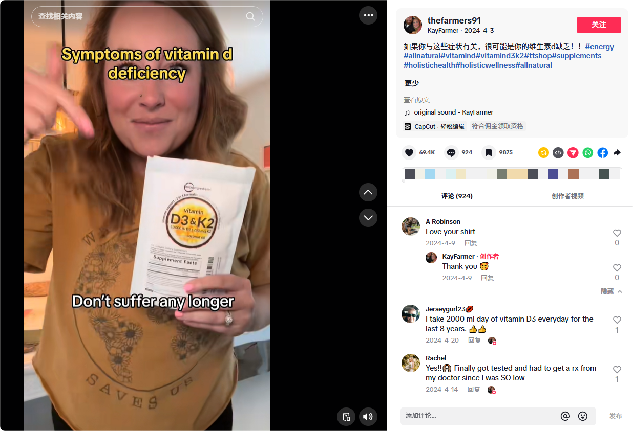 这一策略的效果也很明显,例如,TikTok达人@thefarmers91通过展示维生素D产品在改善疲劳、脱发等症状上的效果,为品牌吸引了大量关注,单条视频播放量就超过了410万次。