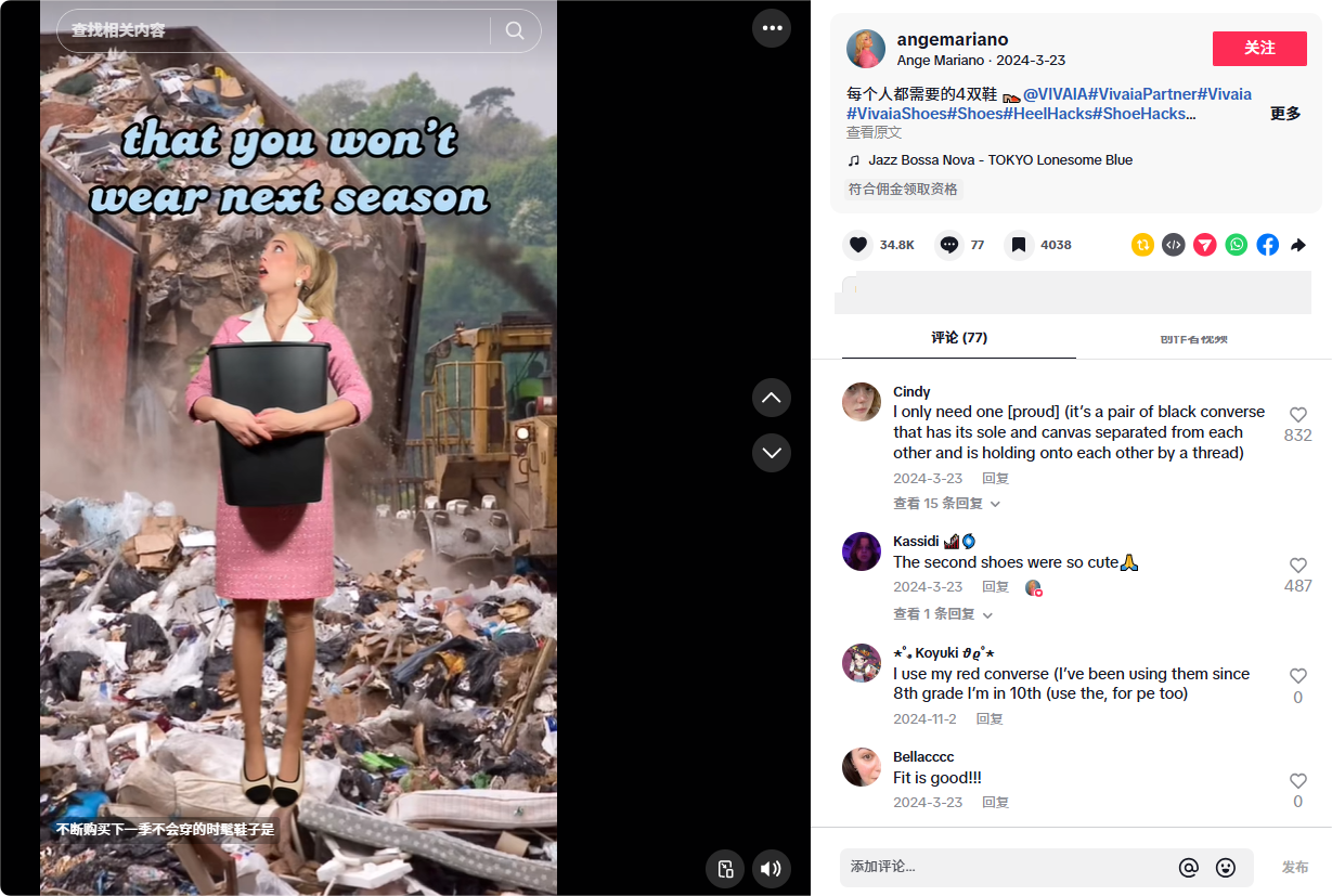 例如,他们在2024年3月发布的一条鞋子展示视频,就是在开头将VIVAIA品牌的卖点与传统高跟鞋痛点进行结合,用“I never thought in my life that I can have stylish and comfortable heels.(我一生中从未想过我可以拥有时尚舒适的高跟鞋)”作为钩子吸引用户停留。