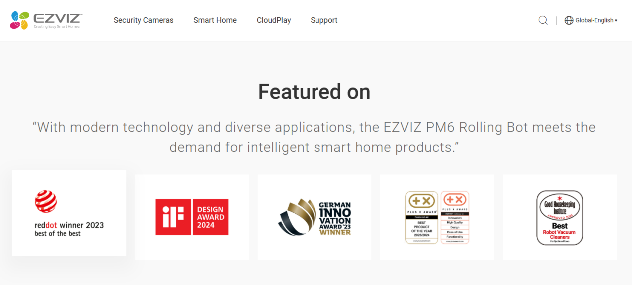 当用户通过TikTok视频对产品产生初步兴趣后,EZVIZ通过引导将其吸引至品牌独立站。在这里,产品线清晰分类,方便选购。还设立了产品奖项专区,展示获得的专业认证和媒体奖项,这对于高客单价、重决策的安防产品而言,是打消疑虑、促成购买的关键一环。