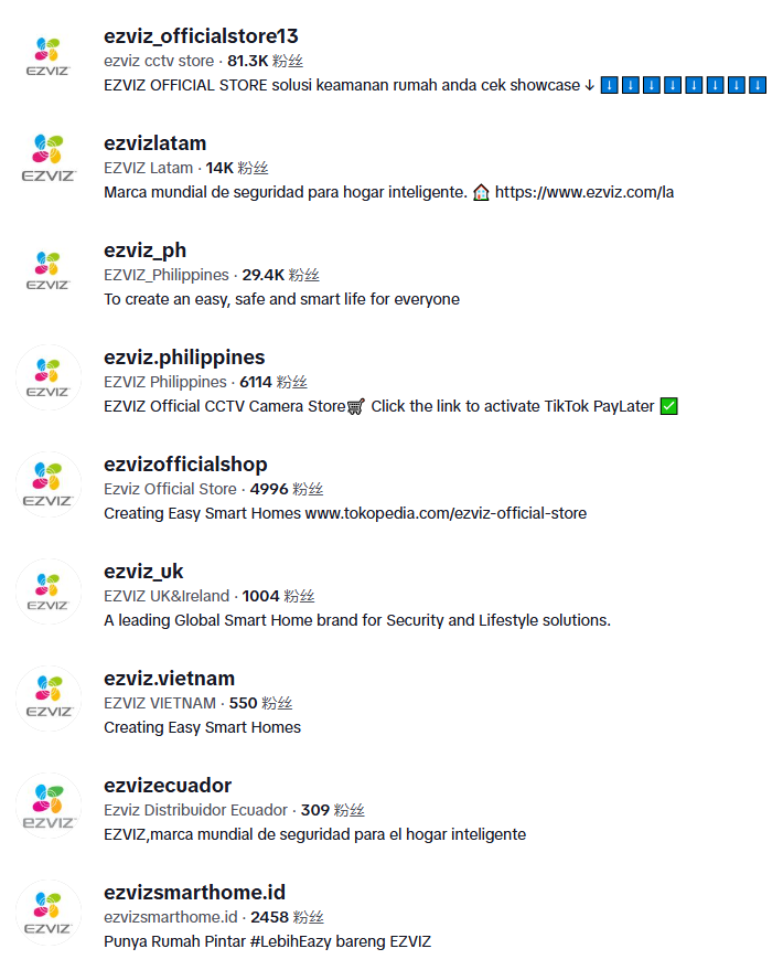 在TikTok上,EZVIZ没有用一个全球账号泛泛而谈,而是深入实施多账号分区运营,针对巴西、菲律宾、英国、马来西亚等不同市场开设独立账号。