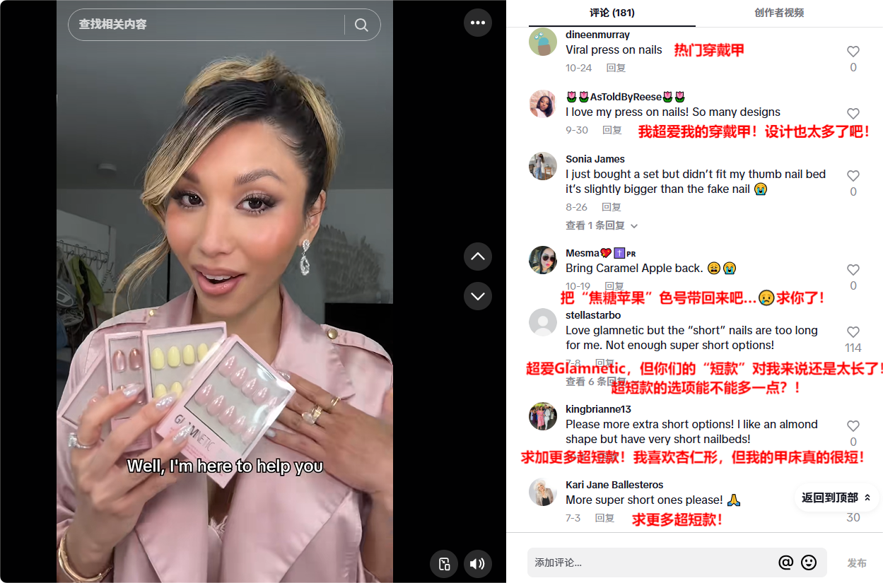 在TikTok上,Glamnetic绝非简单打广告。它将自己打造成一个美妆灵感库,官方账号联合大量达人,持续输出美甲教程、款式对比、变装挑战等高互动性短视频。这些内容直观、易模仿,极大地降低了用户的理解和尝试门槛。