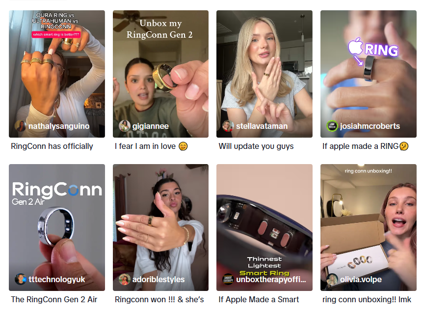 在TikTok上,RingConn深知平台用户偏爱轻松、直观的内容,因此其合作达人多以开箱、日常佩戴场景展示为主。