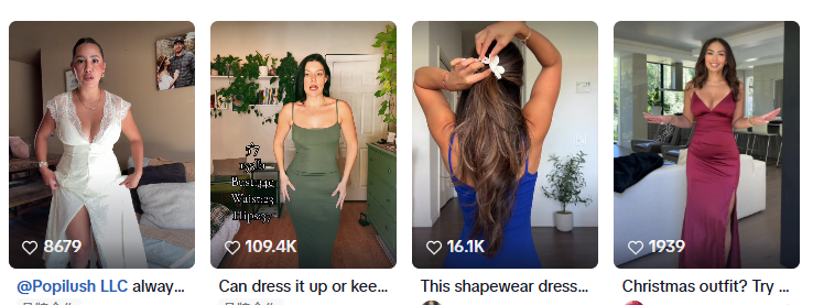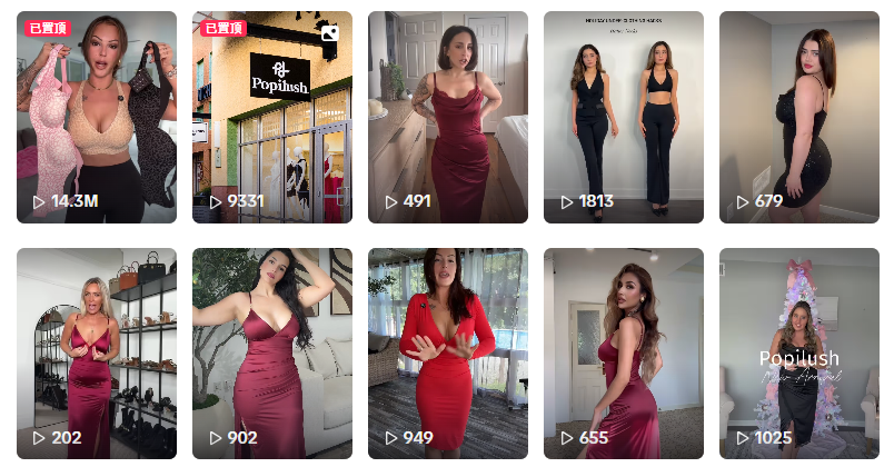 从kalodata平台所提供的数据可以看到,Popilush品牌每日都会根据当下热门的品类在账号内发布多条视频,或是用户反馈,或是品牌拍摄的穿搭展示,内容并不局限,重点是突出服饰以及“挂车”。