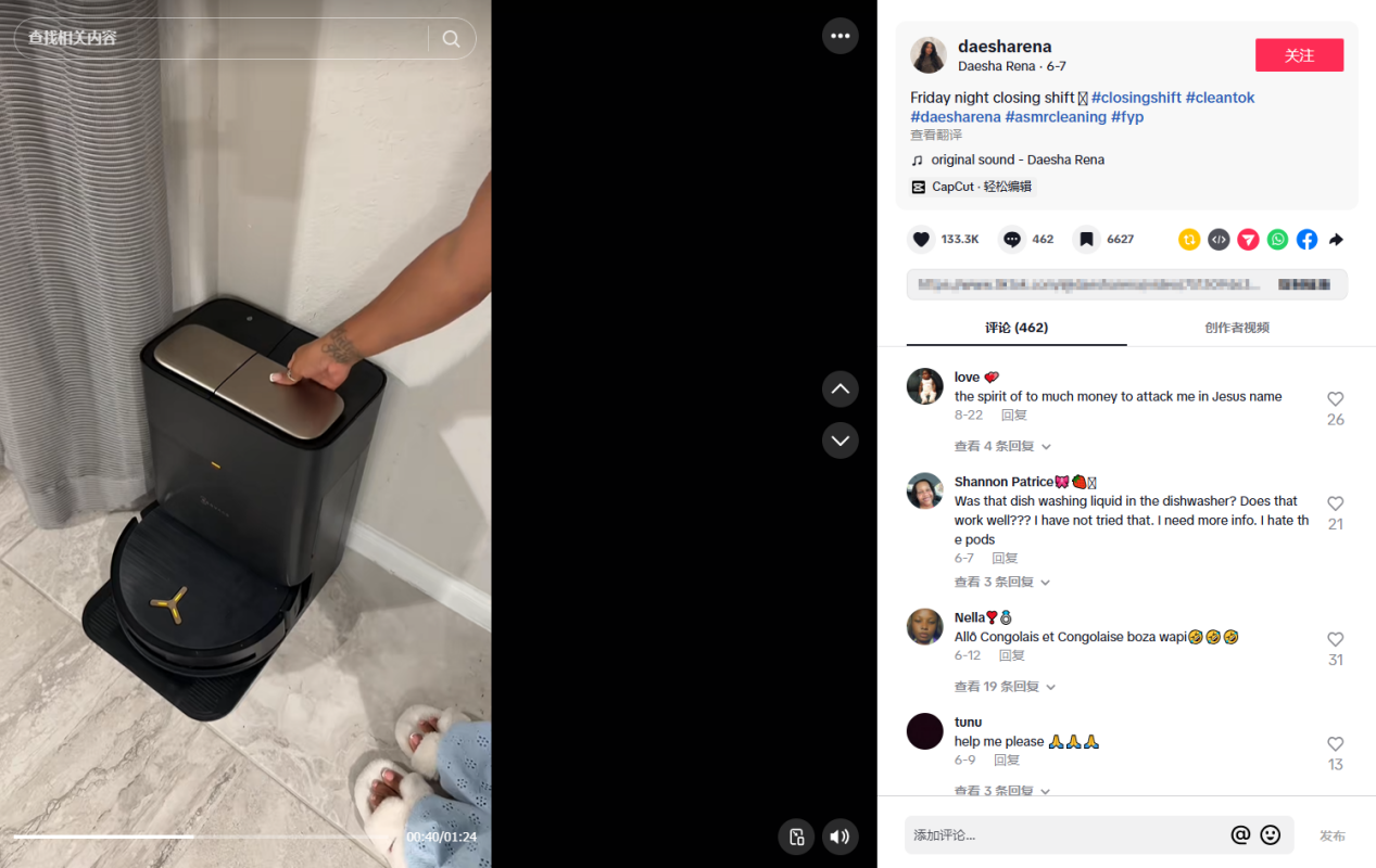 拥有78.7万粉丝的TikTok居家达人@daesharena,便是ECOVACS品牌的合作者。