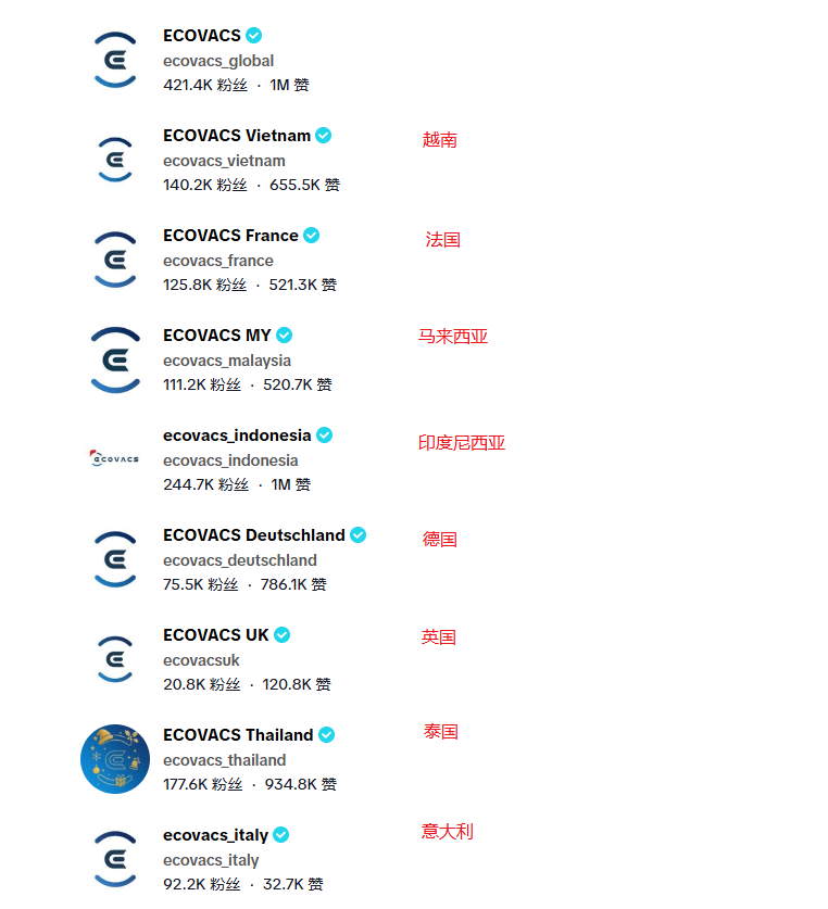除了全球主营账号@ecovacs_global外,针对越南、法国、马来西亚、印度尼西亚、德国、泰国、意大利、新加坡、英国等市场,品牌都开设了本地TikTok账号,让内容在语言、形式、场景上尽量贴近当地用户。