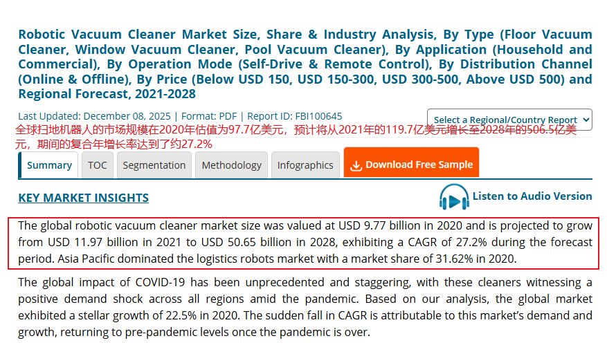 fortunebusinessinsights上的行业报告显示,全球扫地机器人的市场规模在2020年估值为97.7亿美元,预计将从2021年的119.7亿美元增长至2028年的506.5亿美元,期间的复合年增长率为27.2%。