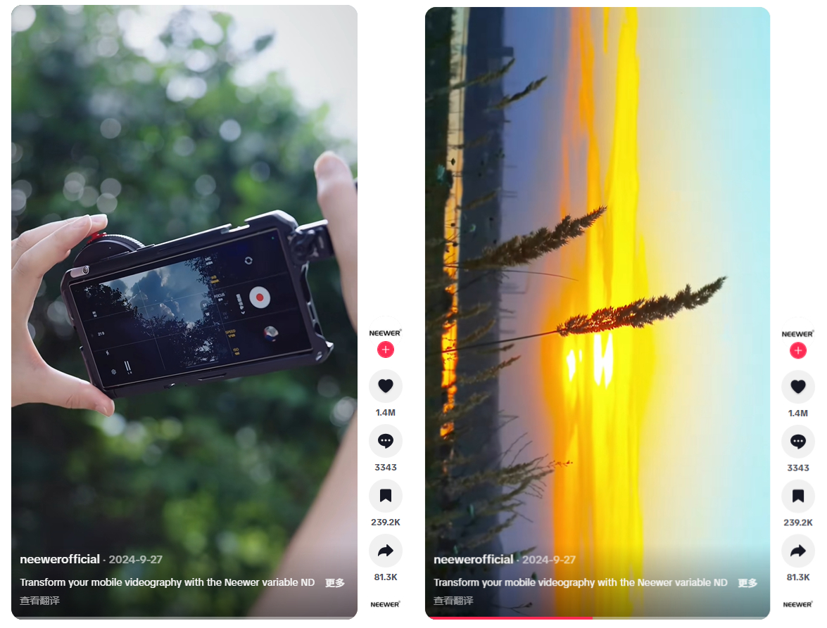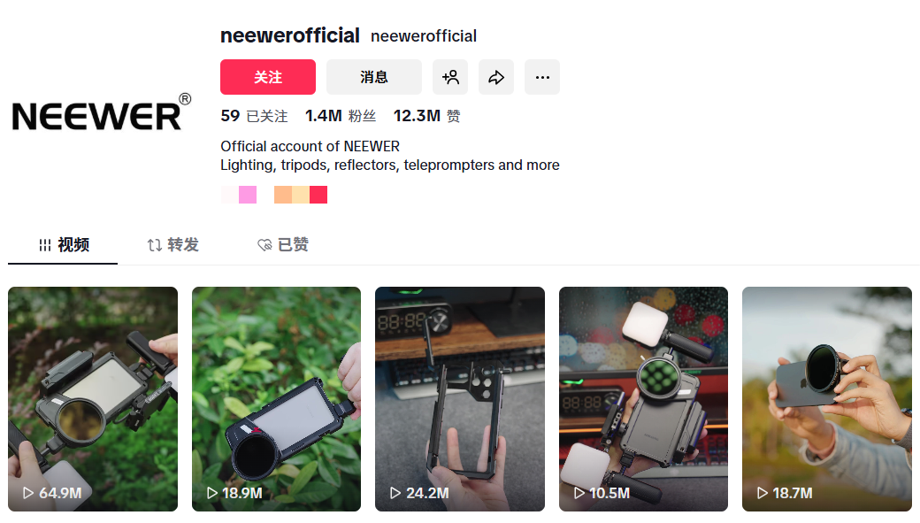 目前,其官方账号@neewerofficial已累计粉丝超过140万,总播放量约5.6亿次,在细分摄影配件品牌中处于前列水平。