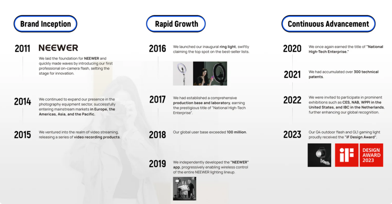据了解,Neewer品牌成立于2011年,总部位于深圳,其母公司是一家集设计、研发、制造和销售为一体的综合型影像设备企业。