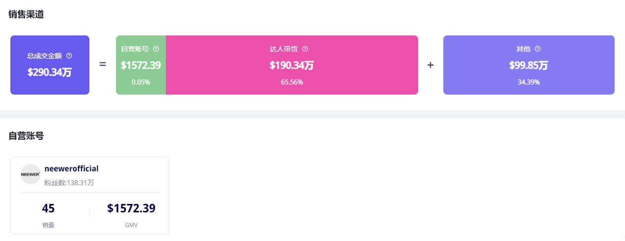 公开数据显示,品牌TikTok小店NEEWER的总成交金额为290.34万美元,其中通过达人带货贡献的成交金额达到了190.34万美元,占比高达65.56%。