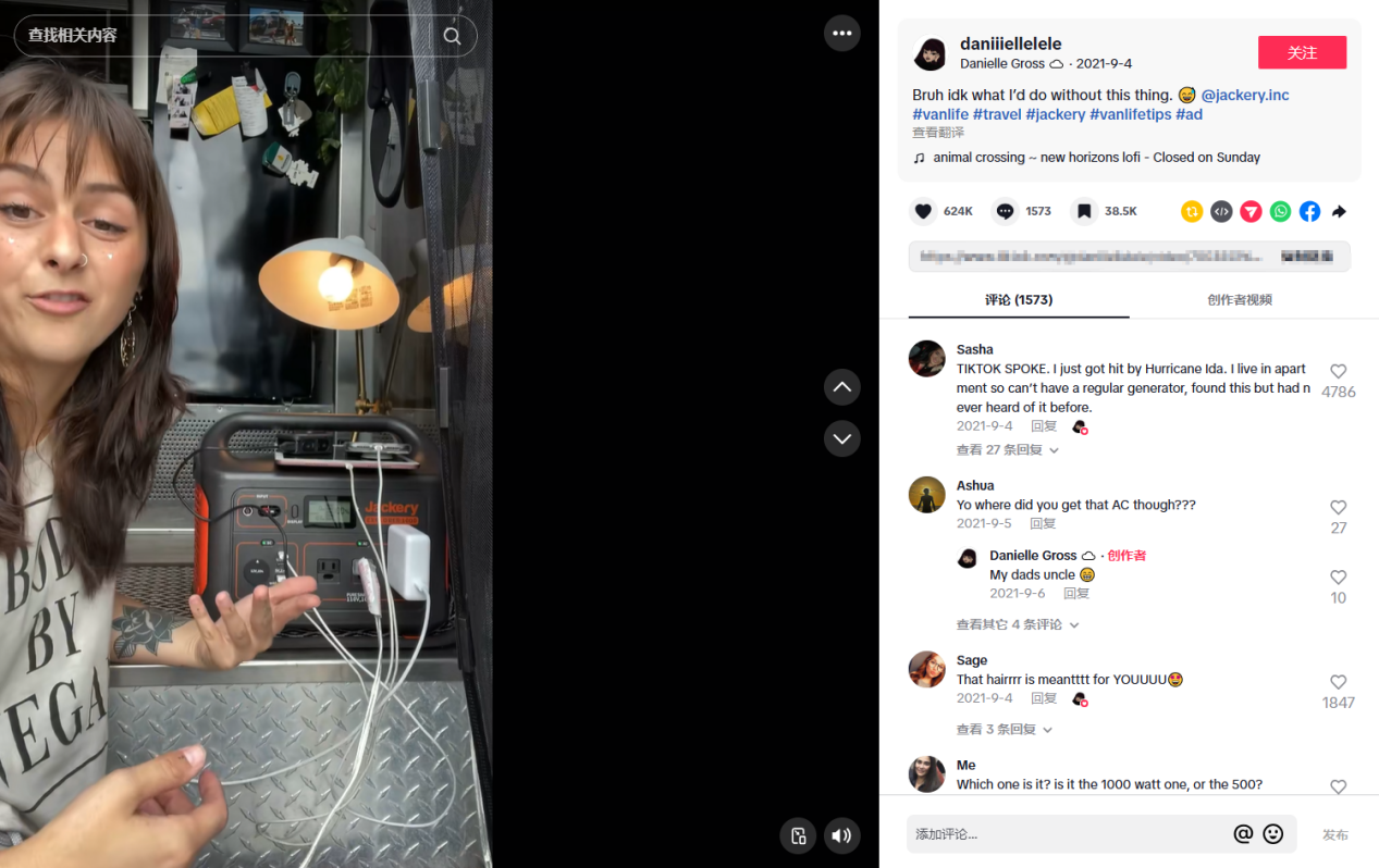 像拥有660万粉丝的TikTok居家生活达人@eastcoastdiy,就为Jackery品牌的便携储备能源拍摄了推广短视频。