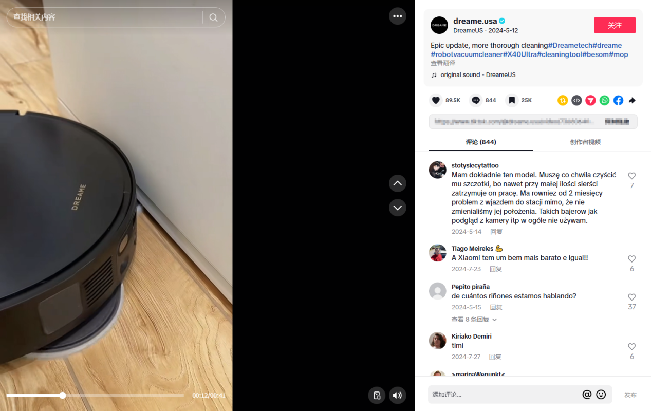 不同于传统家电品牌依赖参数展示的营销方式,@dreame.usa账号更注重以实测内容建立用户信任。通过展示产品在真实场景中的清洁表现,让用户直观感受到产品力。