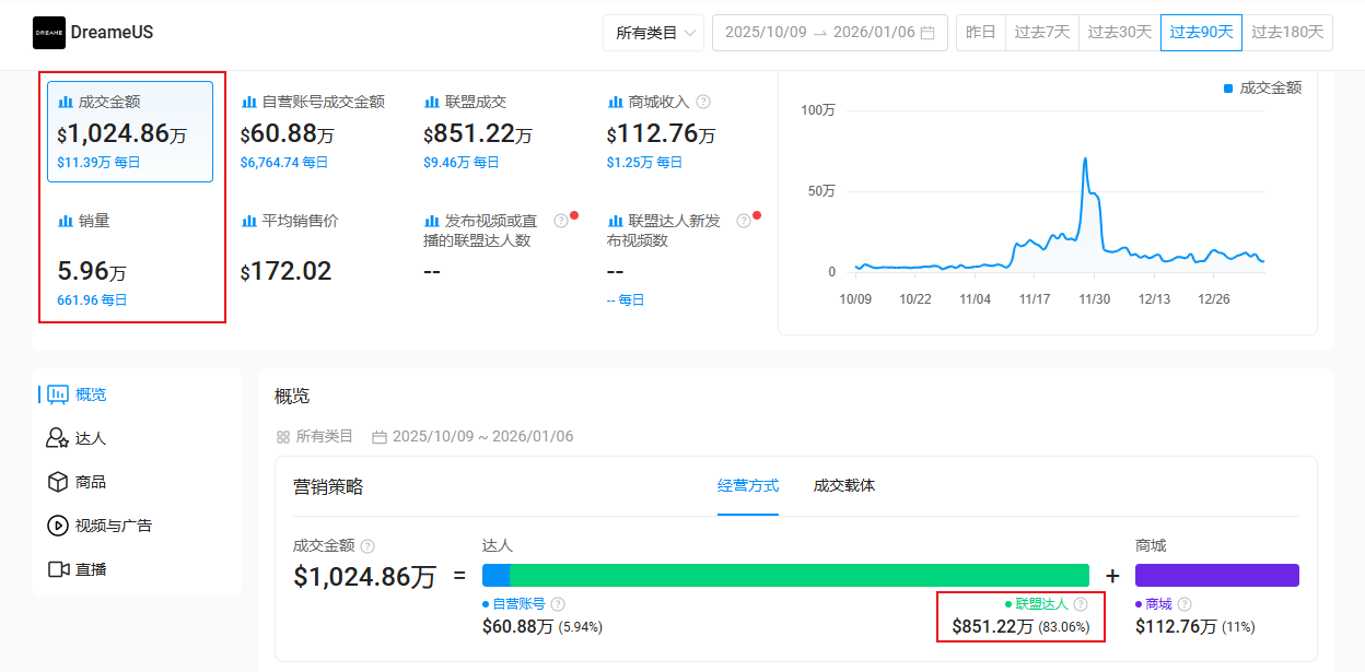 其中,通过联盟达人渠道带来的成交额约为851.22万美金,占整体销售的83.06%,是绝对主力来源。