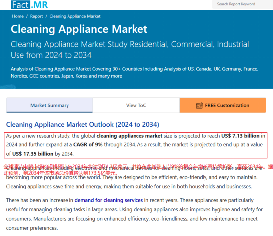 全球清洁电器的市场规模在2024年估值为71.3亿美元,预测在2034年,该市场的总价值将达到173.5亿美元,期间的几年时间将以9%的复合年增长率保持持续扩张。