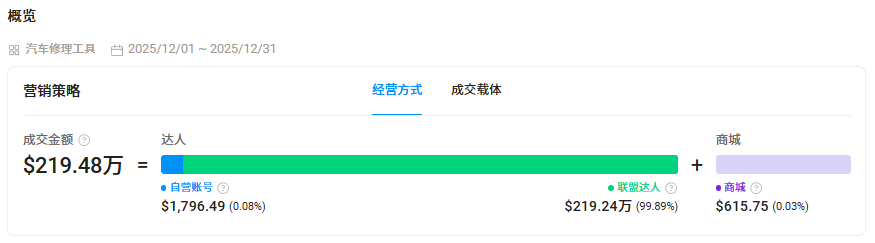 根据数据显示,Hieha Life在2025年12月的成交金额为219.48万美元。而在这里面,联盟达人带货的比重足足占据了99%以上,足以可见其重要性。