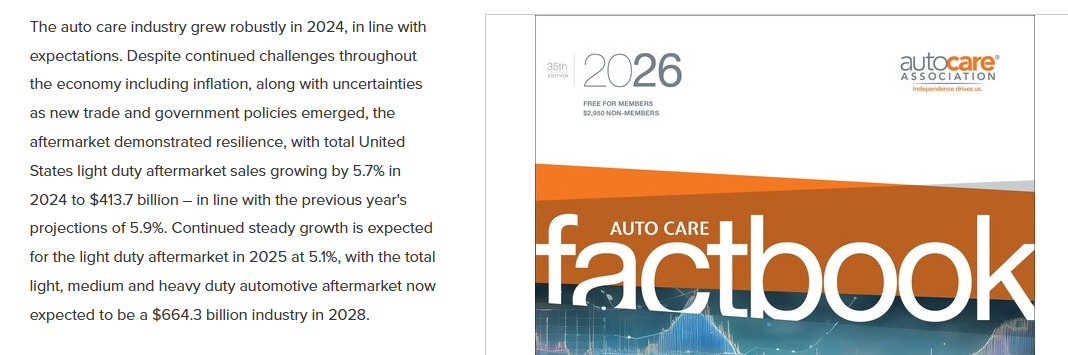 根据美国汽车养护协会(ACA)的预测,整个轻型、中型和重型汽车后市场规模预计将在2025年增长5.1%,并预计到2028年销售额将达到6643亿美元。