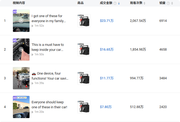 这背后,是其王牌产品“汽车应急启动电源”持续的火爆:单月拿下369.6万美元(约合人民币2579 万元)销售额,一度登顶TikTok汽车修理类目TOP1!