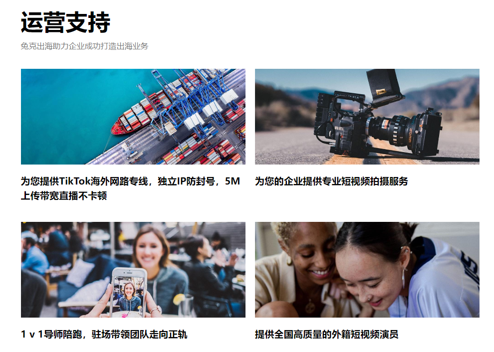 以业内知名的兔克出海为例,作为TikTok官方认证的服务商,他们提供从市场调研、账号搭建、内容创作到广告投放、数据优化的全链路服务。