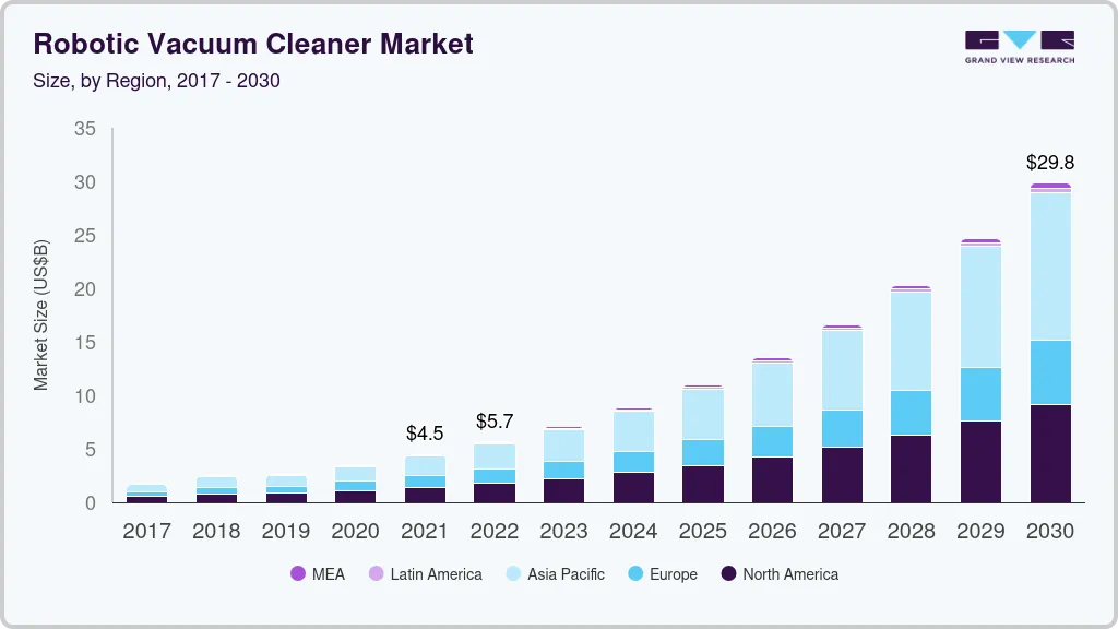 据Grand View Research的研究显示,全球扫地机器人的市场规模自2017年起便连年攀升。2021年市场估值已达45亿美元,预计到2030年将激增至298亿美元,年复合增长率高达23.4%。