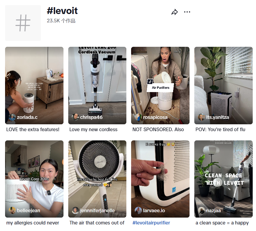 在TikTok搜索#levoit标签,可以看到2.35万条视频涵盖了测评、口播、生活场景演绎等多种类型。达人们能充分发挥创意,从不同角度展现产品的多样性和实用性。