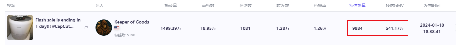 最终,该视频获得了1499.39万次播放、累积获赞18.96万个,在为品牌带来了不错的流量和曝光的同时,还带动了9884个销量,成交金额达41.17万美金。