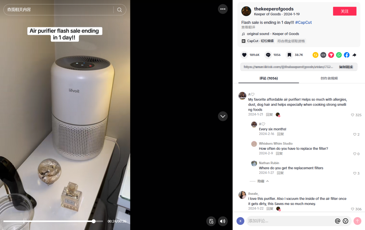 例如,粉丝数量仅为5196的TikTok达人@Keeper of Goods在2024年1月发布了一条使用 Levoit品牌空气净化器的视频,以日常的视角展示了产品吸附尘螨、静音运行和智能操控等特点。