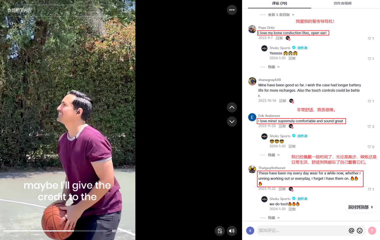视频里,达人们分别对Shokz的最新款旗舰耳机进行了测评,除了在室内体验,还走到户外进行打球等运动测试,用真实的使用感受,向粉丝们传递了产品的核心优势。