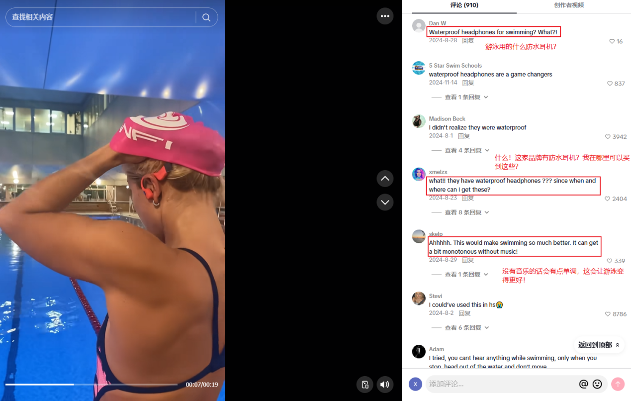 这条视频一经发布,便在游泳爱好者群体中引发了强烈的反响,评论区满是高意向的用户咨询与种草的留言。