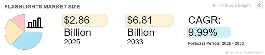 根据Global Growth Insights的数据,2024年全球手电筒市场规模已达28.6亿美元,预计到2033年将增长至68.1亿美元。