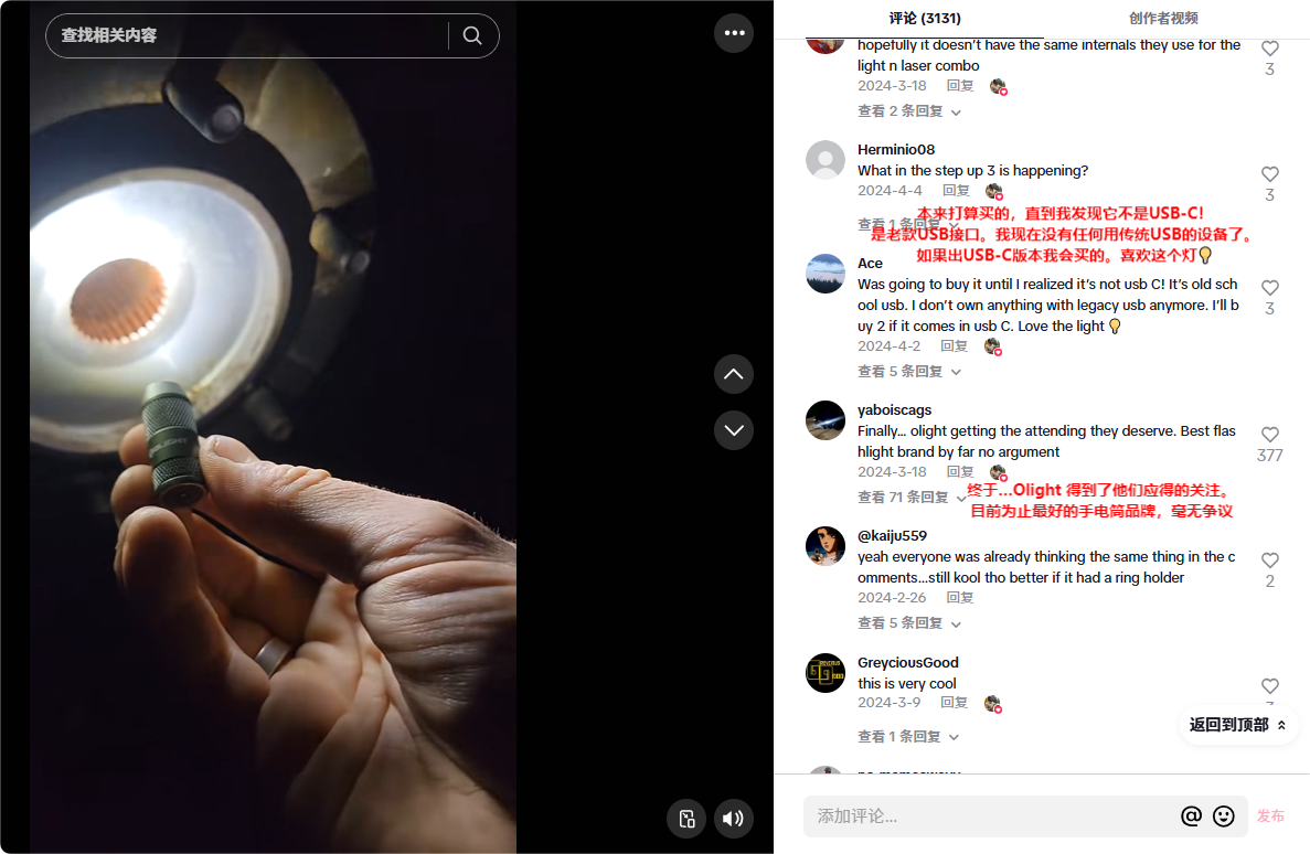 该视频最终获得了超1360万播放,就连评论区也在夸赞Olight品牌的出色。