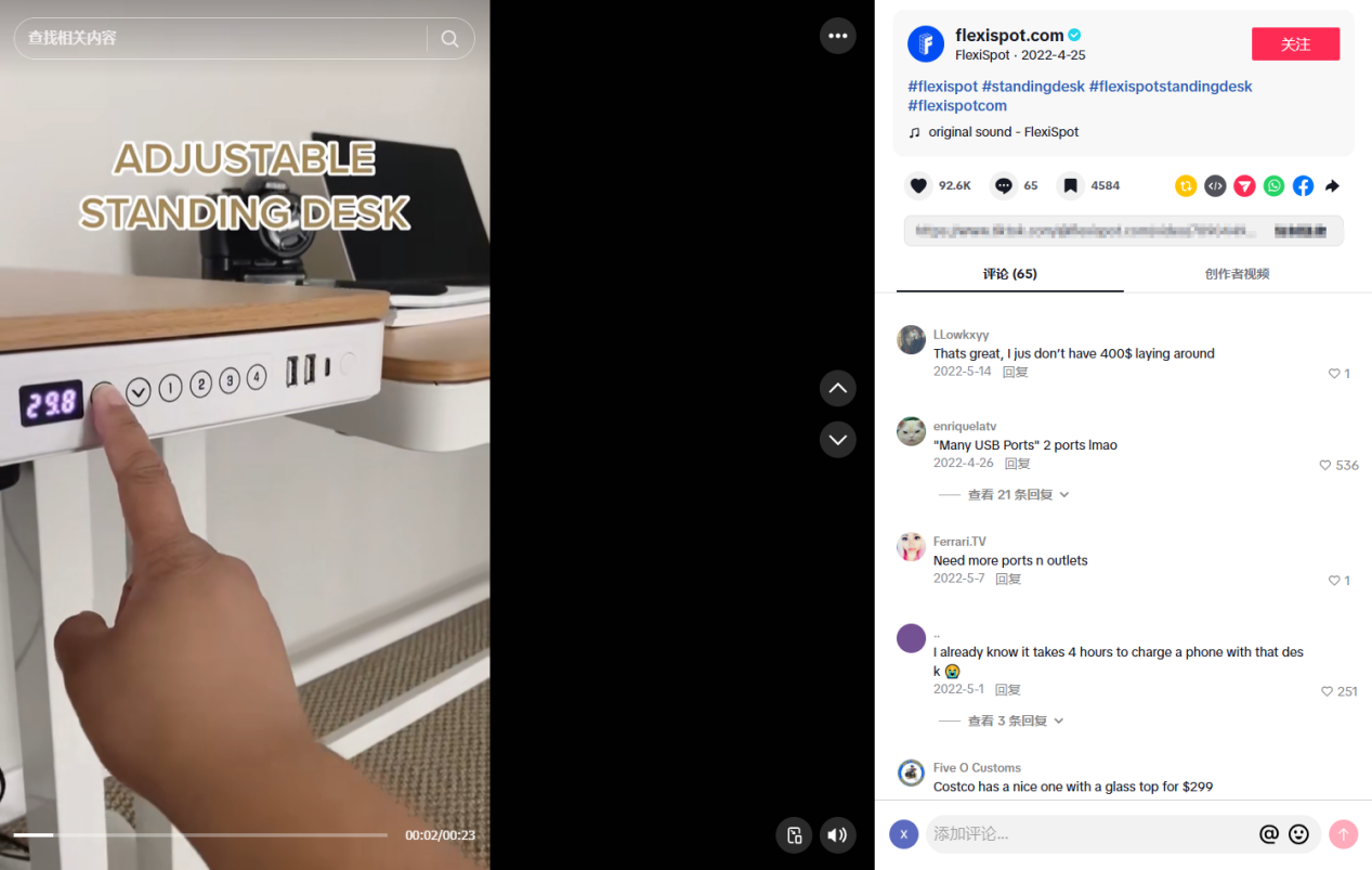 所以,在官方账号主动发声的同时,Flexispot品牌还很懂得借力外部传播势能——鼓励粉丝分享自己所购买的Flexispot产品的使用体验,吸引了众多TikTok用户参与其中,创作并发布了大量UGC内容。