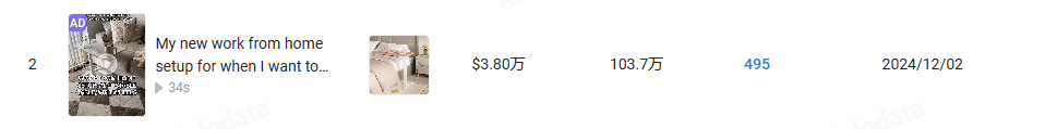 截至目前,这条视频的播放量达到了140万次,为Flexispot品牌带来了495件产品销量,预估销售额为3.8万美元。