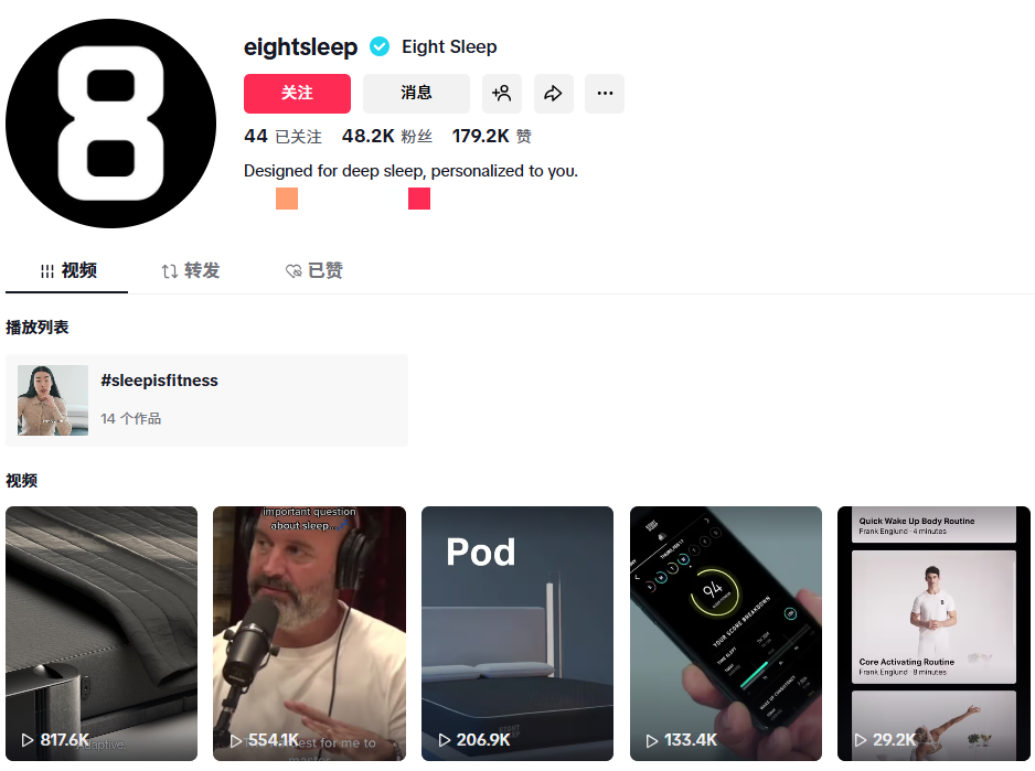 Eight Sleep品牌的官方TikTok账号@EightSleep目前拥有约4.8万粉丝,内容以专业运动员种草短片、用户使用场景反馈和品牌方解答为主。