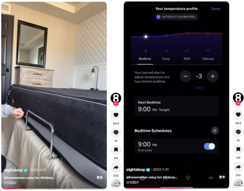 在视频里,用户充分展示了从安装Eight Sleep床垫到睡眠的全过程,以一种生活化的日常记录,悄然完成了产品核心功能与可靠感的直观传达。