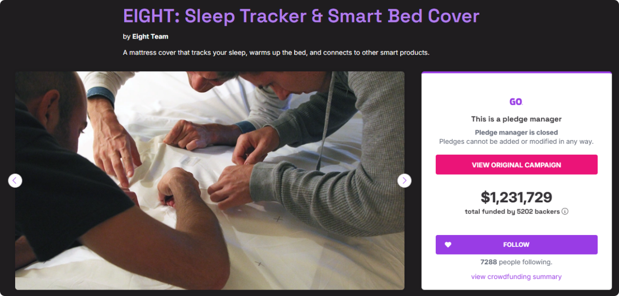 2015年,Eight Sleep在Indiegogo上线首款智能床垫罩“EIGHT”,主打智能控温、睡眠监测和接入智能家居生态,最终获得超过6000名支持者,众筹金额突破120万美元,这成为品牌早期最关键的市场验证。