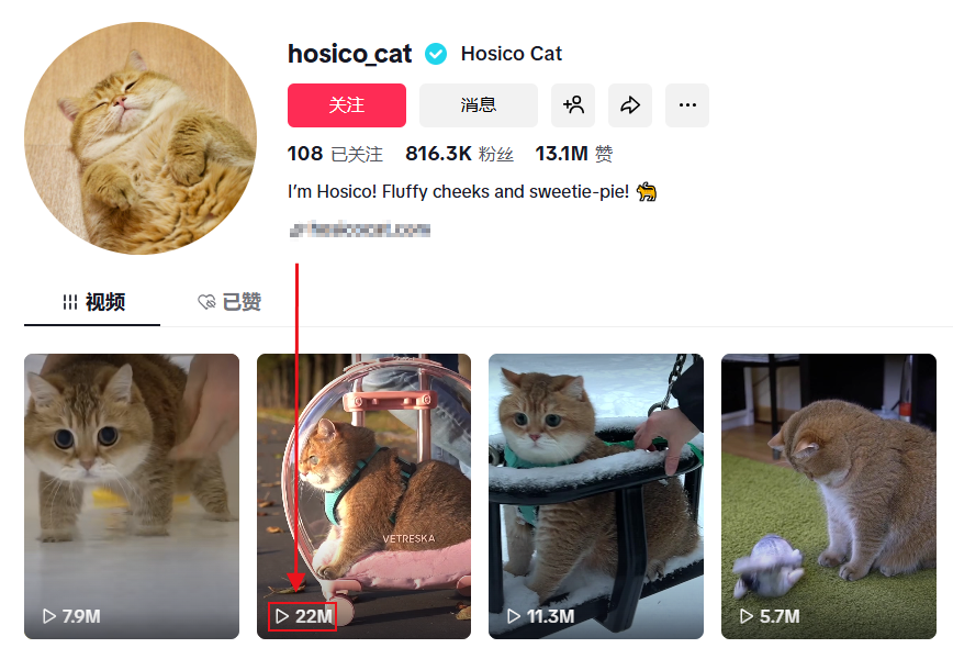 拥有81.63万粉丝的TikTok宠物达人@hosico_cat,是一只可爱的金渐层英短猫,它为Vetreska品牌拍摄了一条宠物日常出行的推广视频。