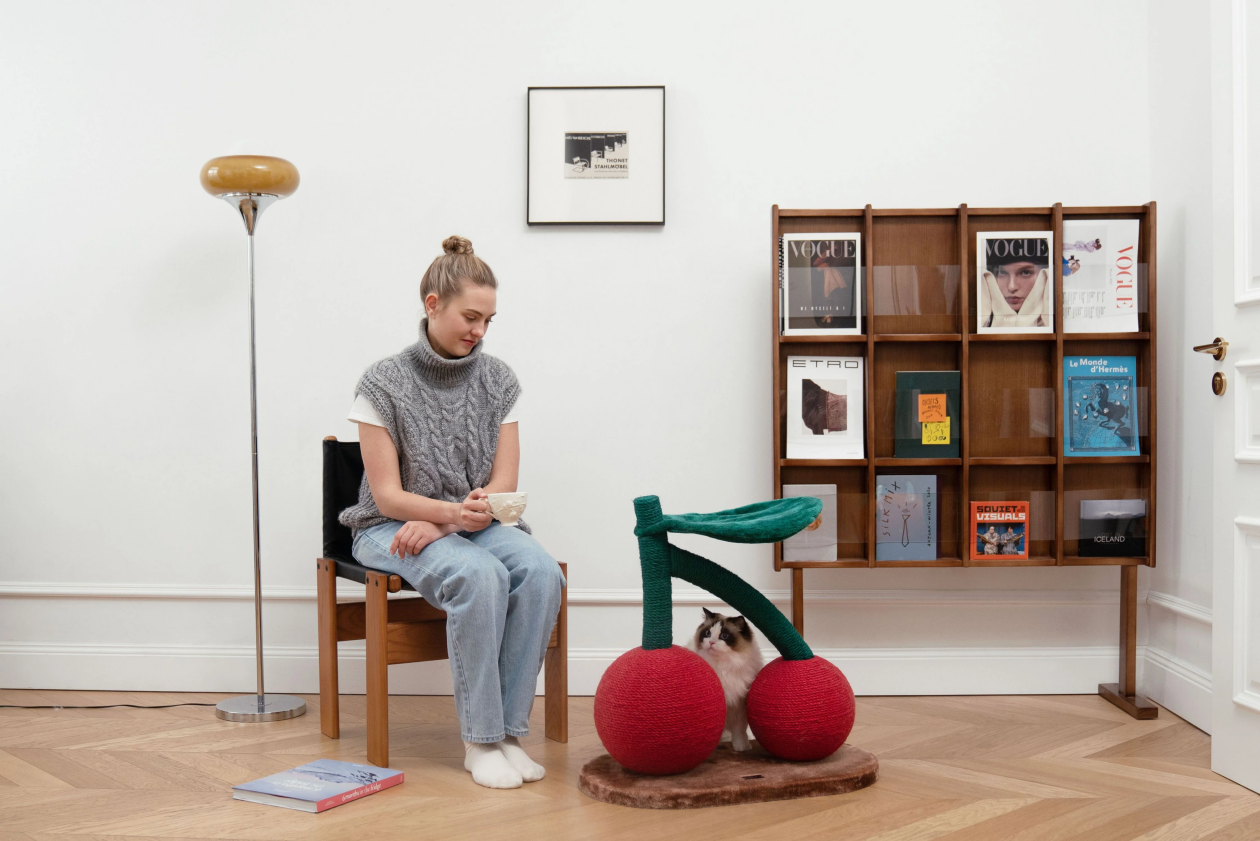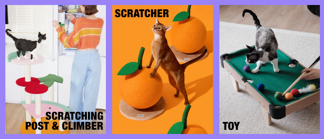 Vetreska品牌的产品线布局丰富,涵盖了猫爬架、猫砂盆、出行包、宠物碗等多个品类,将仙人掌、草莓、西瓜、樱桃、橙子等自然元素,与高饱和的流行色彩融入产品的设计中,打造出兼具功能性与社交属性的宠物家具。