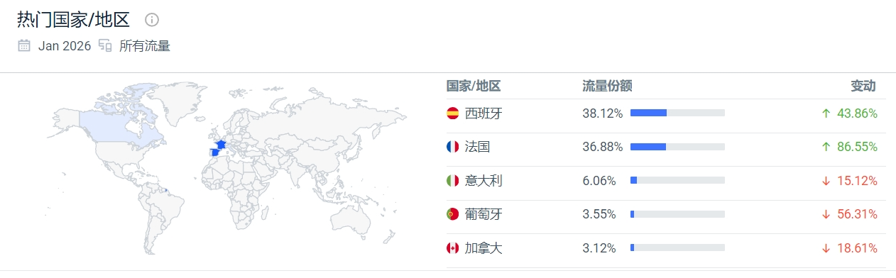 此外,Cosori在欧洲市场还针对性搭建了cosori.site等区域性网站,例如2026年1月该站的访问量约为16.48万次,其中西班牙和法国的流量占比超过75%,天然服务于当地语言和本地零售渠道的联动。