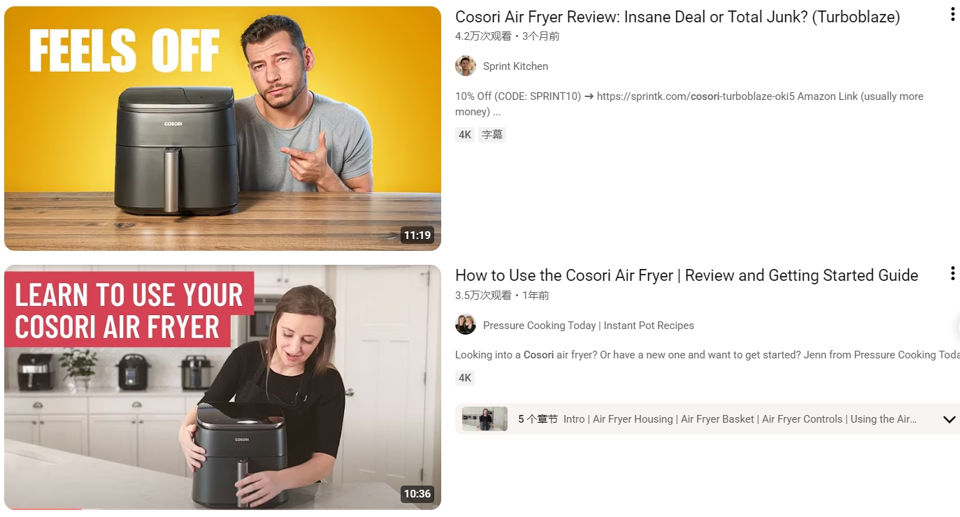 与TikTok偏重“快速种草”不同,YouTube则更适合承载长视频、深度测评与对比内容。Cosori品牌重点合作的是家电测评类UP主以及厨房小家电爱好者,他们会从结构、功能、能耗、材质、实际烹饪效果等多个维度,对产品进行全方位拆解。